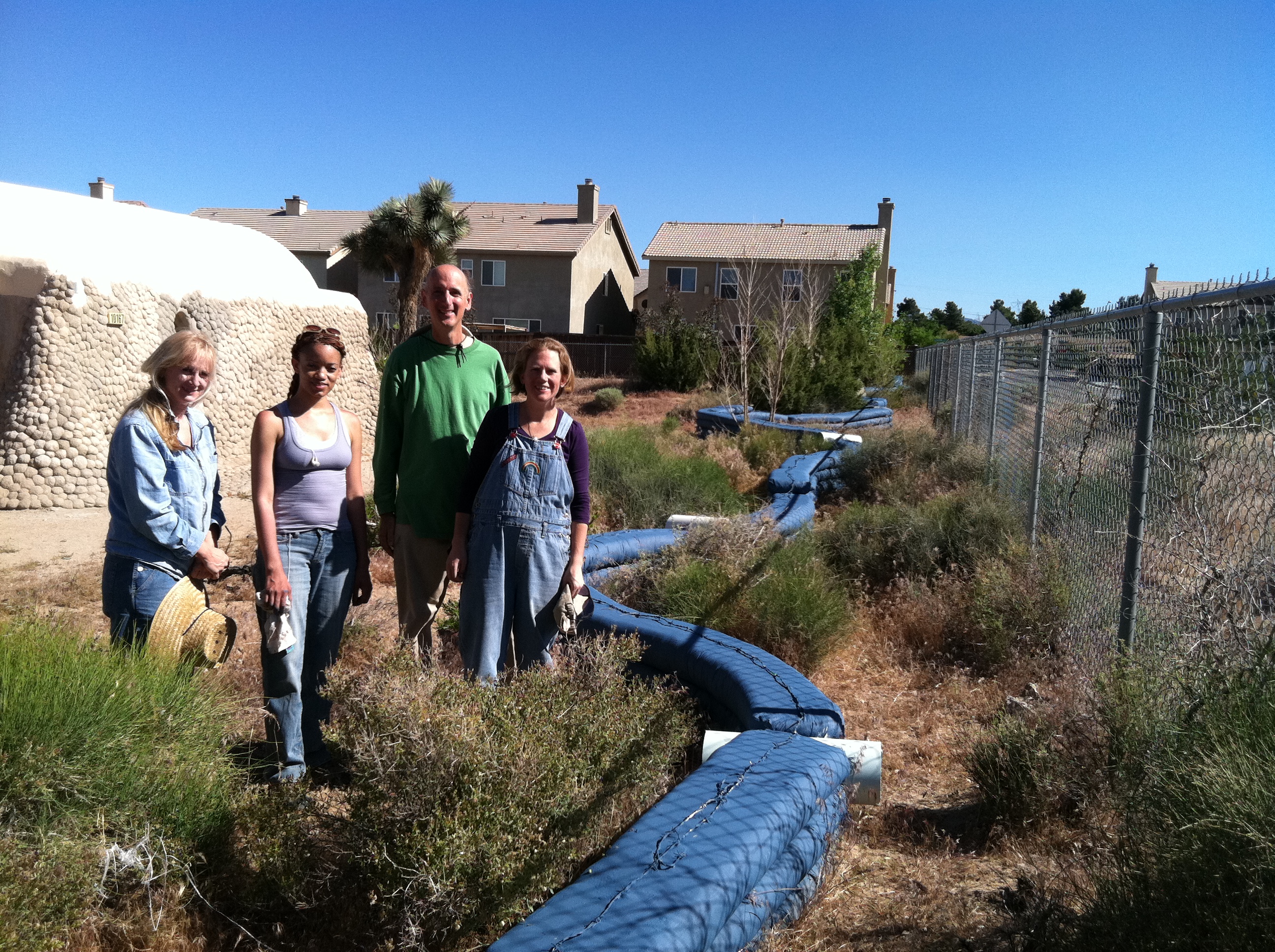 Today, the first day of our extended workshop, we are putting in an earthen floor stabilized with cement. Mark Harmon, who helped build the dome years ago, and currently the technical director of Cal-Earth, wants to have the floor have a 2% grade so water will flow towards the door and into the small courtyard away from the dome. So far this morning, we have been working on leveling the floor to the 2% grade.