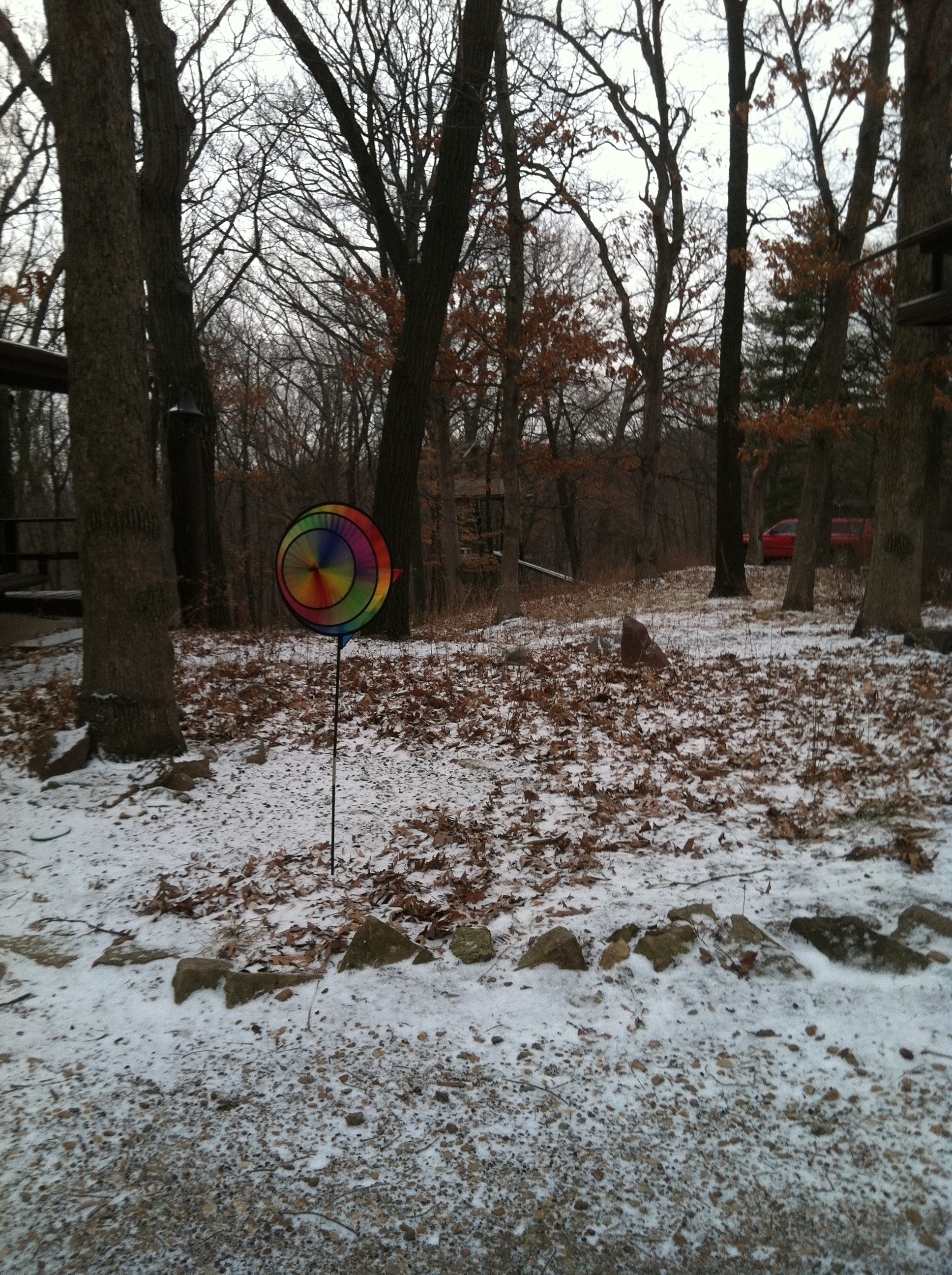 Cold winds blow, tree house awaits spring, and the rainbow spinner dances