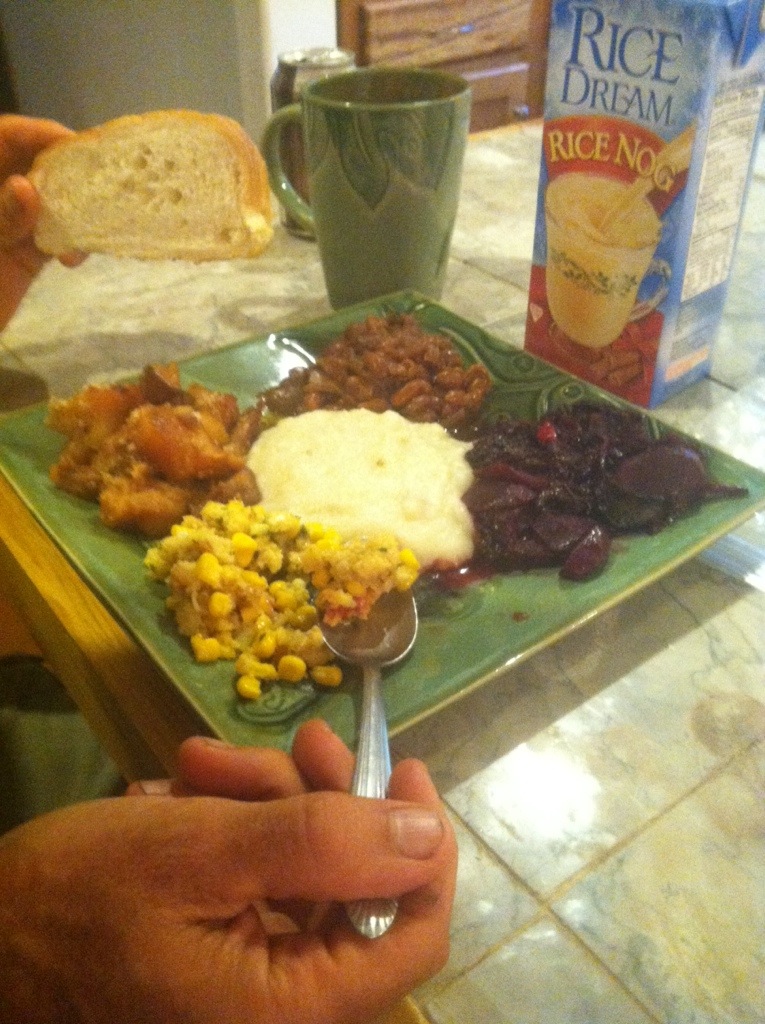 We went to a potluck that started around 11 am. Mark learned to change the oil on our truck while Rachel was in the kitchen cooking/food prep with Laura. As you can see from Mark’s plate, there were five vegan dishes (corn spoon bread, beets, beans, mashed potatoes, & oven-baked sweet and regular potatoes) that we enjoyed immensely. We ate around 4 pm. I made a raw fruit pie with